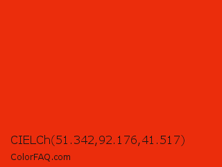 CIELCh 51.342,92.176,41.517 Color is a normal red color and the nearest color is Red RYB #fe2712. Hex code #eb2d0c and RGB value is rgb(235,45,12). In RGB color space, this color is composed of 92% red, 18% green, 5% blue, In CMYK color space, this color is composed of 0% cyan, 81% magenta, 95% yellow , 8% black , In HSL color space, this color has a hue angle of 9° , 90% saturation and 48% lightness.