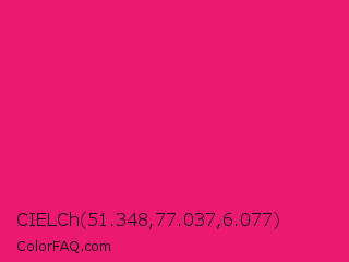 CIELCh 51.348,77.037,6.077 Color is a normal rose color and the nearest color is Razzmatazz #e3256b. Hex code #eb1a70 and RGB value is rgb(235,26,112). In RGB color space, this color is composed of 92% red, 10% green, 44% blue, In CMYK color space, this color is composed of 0% cyan, 89% magenta, 52% yellow , 8% black , In HSL color space, this color has a hue angle of 335° , 84% saturation and 51% lightness.