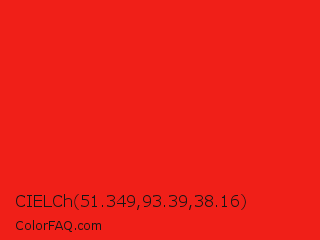 CIELCh 51.349,93.39,38.16 Color is a normal red color and the nearest color is Red Pigment #ed1c24. Hex code #f01f18 and RGB value is rgb(240,31,24). In RGB color space, this color is composed of 94% red, 12% green, 9% blue, In CMYK color space, this color is composed of 0% cyan, 87% magenta, 90% yellow , 6% black , In HSL color space, this color has a hue angle of 2° , 88% saturation and 52% lightness.
