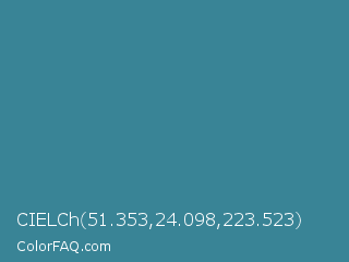 CIELCh 51.353,24.098,223.523 Color is a normal cyan color and the nearest color is Astral #327da0. Hex code #398496 and RGB value is rgb(57,132,150). In RGB color space, this color is composed of 22% red, 52% green, 59% blue, In CMYK color space, this color is composed of 62% cyan, 12% magenta, 0% yellow , 41% black , In HSL color space, this color has a hue angle of 192° , 45% saturation and 41% lightness.
