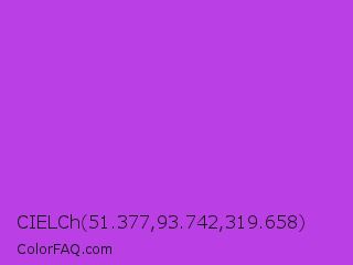 CIELCh 51.377,93.742,319.658 Color is a normal purple color and the nearest color is Medium Orchid #ba55d3. Hex code #ba3fe4 and RGB value is rgb(186,63,228). In RGB color space, this color is composed of 73% red, 25% green, 89% blue, In CMYK color space, this color is composed of 18% cyan, 72% magenta, 0% yellow , 11% black , In HSL color space, this color has a hue angle of 285° , 75% saturation and 57% lightness.