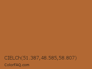 CIELCh 51.387,48.585,58.807 Color is a normal orange color and the nearest color is Copper #b87333. Hex code #b26833 and RGB value is rgb(178,104,51). In RGB color space, this color is composed of 70% red, 41% green, 20% blue, In CMYK color space, this color is composed of 0% cyan, 42% magenta, 71% yellow , 30% black , In HSL color space, this color has a hue angle of 25° , 55% saturation and 45% lightness.