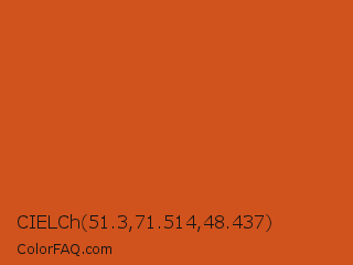 CIELCh 51.3,71.514,48.437 Color is a normal orange color and the nearest color is Orange Roughy #c45719. Hex code #d0521c and RGB value is rgb(208,82,28). In RGB color space, this color is composed of 82% red, 32% green, 11% blue, In CMYK color space, this color is composed of 0% cyan, 61% magenta, 87% yellow , 18% black , In HSL color space, this color has a hue angle of 18° , 76% saturation and 46% lightness.