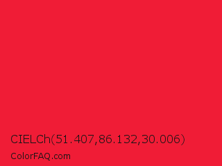 CIELCh 51.407,86.132,30.006 Color is a normal red color and the nearest color is Imperial Red #ed2939. Hex code #f01c36 and RGB value is rgb(240,28,54). In RGB color space, this color is composed of 94% red, 11% green, 21% blue, In CMYK color space, this color is composed of 0% cyan, 88% magenta, 78% yellow , 6% black , In HSL color space, this color has a hue angle of 353° , 88% saturation and 53% lightness.