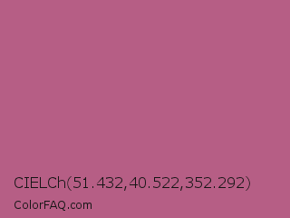 CIELCh 51.432,40.522,352.292 Color is a normal rose color and the nearest color is Tapestry #b05e81. Hex code #b65e85 and RGB value is rgb(182,94,133). In RGB color space, this color is composed of 71% red, 37% green, 52% blue, In CMYK color space, this color is composed of 0% cyan, 48% magenta, 27% yellow , 29% black , In HSL color space, this color has a hue angle of 333° , 38% saturation and 54% lightness.