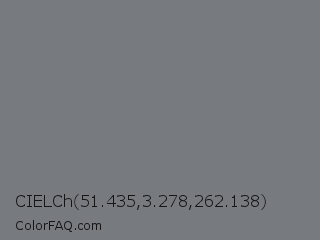CIELCh 51.435,3.278,262.138 Color is a normal blue color and the nearest color is Rolling Stone #747d83. Hex code #777b80 and RGB value is rgb(119,123,128). In RGB color space, this color is composed of 47% red, 48% green, 50% blue, In CMYK color space, this color is composed of 7% cyan, 4% magenta, 0% yellow , 50% black , In HSL color space, this color has a hue angle of 213° , 4% saturation and 48% lightness.