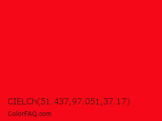 CIELCh 51.437,97.051,37.17 Color is a normal red color and the nearest color is Vivid Red #f70d1a. Hex code #f50817 and RGB value is rgb(245,8,23). In RGB color space, this color is composed of 96% red, 3% green, 9% blue, In CMYK color space, this color is composed of 0% cyan, 97% magenta, 91% yellow , 4% black , In HSL color space, this color has a hue angle of 356° , 94% saturation and 50% lightness.