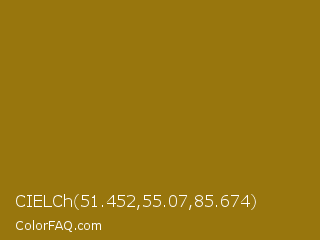 CIELCh 51.452,55.07,85.674 Color is a normal orange color and the nearest color is Buttered Rum #a1750d. Hex code #98760d and RGB value is rgb(152,118,13). In RGB color space, this color is composed of 60% red, 46% green, 5% blue, In CMYK color space, this color is composed of 0% cyan, 22% magenta, 91% yellow , 40% black , In HSL color space, this color has a hue angle of 45° , 84% saturation and 32% lightness.