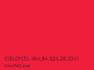 CIELCh 51.464,84.924,28.334 Color is a normal red color and the nearest color is Imperial Red #ed2939. Hex code #f01c3b and RGB value is rgb(240,28,59). In RGB color space, this color is composed of 94% red, 11% green, 23% blue, In CMYK color space, this color is composed of 0% cyan, 88% magenta, 75% yellow , 6% black , In HSL color space, this color has a hue angle of 351° , 88% saturation and 53% lightness.