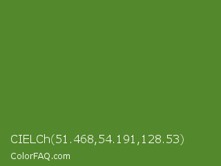 CIELCh 51.468,54.191,128.53 Color is a normal green color and the nearest color is Sap Green #507d2a. Hex code #54882c and RGB value is rgb(84,136,44). In RGB color space, this color is composed of 33% red, 53% green, 17% blue, In CMYK color space, this color is composed of 38% cyan, 0% magenta, 68% yellow , 47% black , In HSL color space, this color has a hue angle of 94° , 51% saturation and 35% lightness.