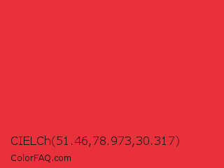 CIELCh 51.46,78.973,30.317 Color is a normal red color and the nearest color is Deep Carmine Pink #ef3038. Hex code #e8313b and RGB value is rgb(232,49,59). In RGB color space, this color is composed of 91% red, 19% green, 23% blue, In CMYK color space, this color is composed of 0% cyan, 79% magenta, 75% yellow , 9% black , In HSL color space, this color has a hue angle of 357° , 80% saturation and 55% lightness.