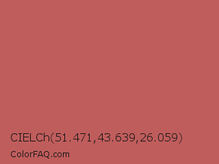 CIELCh 51.471,43.639,26.059 Color is a normal red color and the nearest color is Fuzzy Wuzzy Brown #c45655. Hex code #bf5d5c and RGB value is rgb(191,93,92). In RGB color space, this color is composed of 75% red, 36% green, 36% blue, In CMYK color space, this color is composed of 0% cyan, 51% magenta, 52% yellow , 25% black , In HSL color space, this color has a hue angle of 1° , 44% saturation and 55% lightness.