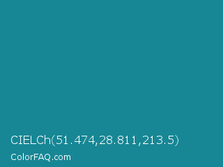 CIELCh 51.474,28.811,213.5 Color is a normal cyan color and the nearest color is Blue Chill #0c8990. Hex code #178795 and RGB value is rgb(23,135,149). In RGB color space, this color is composed of 9% red, 53% green, 58% blue, In CMYK color space, this color is composed of 85% cyan, 9% magenta, 0% yellow , 42% black , In HSL color space, this color has a hue angle of 187° , 73% saturation and 34% lightness.
