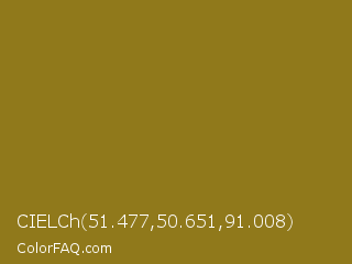 CIELCh 51.477,50.651,91.008 Color is a normal yellow color and the nearest color is Sand Dune #967117. Hex code #90791b and RGB value is rgb(144,121,27). In RGB color space, this color is composed of 56% red, 47% green, 11% blue, In CMYK color space, this color is composed of 0% cyan, 16% magenta, 81% yellow , 44% black , In HSL color space, this color has a hue angle of 48° , 68% saturation and 34% lightness.