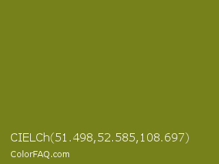 CIELCh 51.498,52.585,108.697 Color is a normal yellow color and the nearest color is Pacifika #778120. Hex code #77811b and RGB value is rgb(119,129,27). In RGB color space, this color is composed of 47% red, 51% green, 11% blue, In CMYK color space, this color is composed of 8% cyan, 0% magenta, 79% yellow , 49% black , In HSL color space, this color has a hue angle of 66° , 65% saturation and 31% lightness.