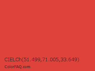 CIELCh 51.499,71.005,33.649 Color is a normal red color and the nearest color is Valencia #d84437. Hex code #dd433b and RGB value is rgb(221,67,59). In RGB color space, this color is composed of 87% red, 26% green, 23% blue, In CMYK color space, this color is composed of 0% cyan, 70% magenta, 73% yellow , 13% black , In HSL color space, this color has a hue angle of 3° , 70% saturation and 55% lightness.