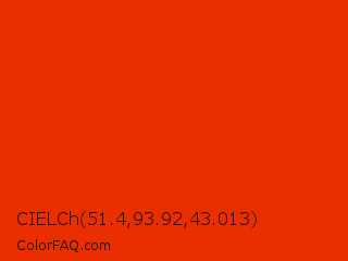 CIELCh 51.4,93.92,43.013 Color is a normal red color and the nearest color is Ferrari Red #ff2800. Hex code #eb2e00 and RGB value is rgb(235,46,0). In RGB color space, this color is composed of 92% red, 18% green, 0% blue, In CMYK color space, this color is composed of 0% cyan, 80% magenta, 100% yellow , 8% black , In HSL color space, this color has a hue angle of 12° , 100% saturation and 46% lightness.