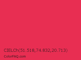 CIELCh 51.518,74.832,20.713 Color is a normal red color and the nearest color is Amaranth #e52b50. Hex code #e82e52 and RGB value is rgb(232,46,82). In RGB color space, this color is composed of 91% red, 18% green, 32% blue, In CMYK color space, this color is composed of 0% cyan, 80% magenta, 65% yellow , 9% black , In HSL color space, this color has a hue angle of 348° , 80% saturation and 55% lightness.