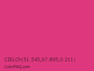 CIELCh 51.545,67.895,0.211 Color is a normal rose color and the nearest color is Cerise #da3287. Hex code #de377d and RGB value is rgb(222,55,125). In RGB color space, this color is composed of 87% red, 22% green, 49% blue, In CMYK color space, this color is composed of 0% cyan, 75% magenta, 44% yellow , 13% black , In HSL color space, this color has a hue angle of 335° , 72% saturation and 54% lightness.