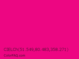 CIELCh 51.549,80.483,358.271 Color is a normal rose color and the nearest color is Mexican Pink #e4007c. Hex code #ed0682 and RGB value is rgb(237,6,130). In RGB color space, this color is composed of 93% red, 2% green, 51% blue, In CMYK color space, this color is composed of 0% cyan, 97% magenta, 45% yellow , 7% black , In HSL color space, this color has a hue angle of 328° , 95% saturation and 48% lightness.