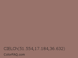 CIELCh 51.554,17.184,36.632 Color is a normal red color and the nearest color is Toast #9a6e61. Hex code #98726a and RGB value is rgb(152,114,106). In RGB color space, this color is composed of 60% red, 45% green, 42% blue, In CMYK color space, this color is composed of 0% cyan, 25% magenta, 30% yellow , 40% black , In HSL color space, this color has a hue angle of 10° , 18% saturation and 51% lightness.