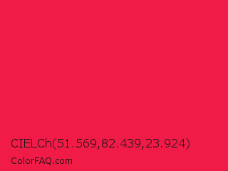 CIELCh 51.569,82.439,23.924 Color is a normal red color and the nearest color is Red Crayola #ee204d. Hex code #f01b47 and RGB value is rgb(240,27,71). In RGB color space, this color is composed of 94% red, 11% green, 28% blue, In CMYK color space, this color is composed of 0% cyan, 89% magenta, 70% yellow , 6% black , In HSL color space, this color has a hue angle of 348° , 88% saturation and 52% lightness.