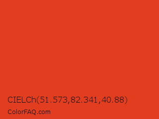 CIELCh 51.573,82.341,40.88 Color is a normal red color and the nearest color is Vermilion #d9381e. Hex code #e33d1f and RGB value is rgb(227,61,31). In RGB color space, this color is composed of 89% red, 24% green, 12% blue, In CMYK color space, this color is composed of 0% cyan, 73% magenta, 86% yellow , 11% black , In HSL color space, this color has a hue angle of 9° , 78% saturation and 51% lightness.