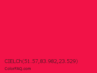 CIELCh 51.57,83.982,23.529 Color is a normal red color and the nearest color is Red Ribbon #ed0a3f. Hex code #f21247 and RGB value is rgb(242,18,71). In RGB color space, this color is composed of 95% red, 7% green, 28% blue, In CMYK color space, this color is composed of 0% cyan, 93% magenta, 71% yellow , 5% black , In HSL color space, this color has a hue angle of 346° , 90% saturation and 51% lightness.