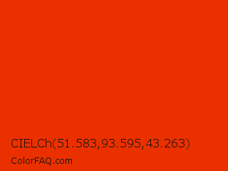 CIELCh 51.583,93.595,43.263 Color is a normal red color and the nearest color is Ferrari Red #ff2800. Hex code #eb3000 and RGB value is rgb(235,48,0). In RGB color space, this color is composed of 92% red, 19% green, 0% blue, In CMYK color space, this color is composed of 0% cyan, 80% magenta, 100% yellow , 8% black , In HSL color space, this color has a hue angle of 12° , 100% saturation and 46% lightness.