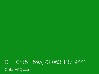 CIELCh 51.595,73.063,137.944 Color is a dark green color and the nearest color is India Green #138808. Hex code #0b8f19 and RGB value is rgb(11,143,25). In RGB color space, this color is composed of 4% red, 56% green, 10% blue, In CMYK color space, this color is composed of 92% cyan, 0% magenta, 83% yellow , 44% black , In HSL color space, this color has a hue angle of 126° , 86% saturation and 30% lightness.