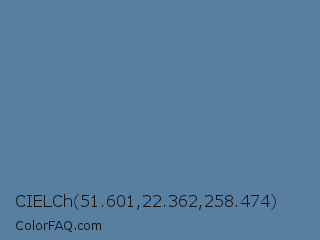 CIELCh 51.601,22.362,258.474 Color is a normal blue color and the nearest color is Horizon #5a87a0. Hex code #587fa0 and RGB value is rgb(88,127,160). In RGB color space, this color is composed of 35% red, 50% green, 63% blue, In CMYK color space, this color is composed of 45% cyan, 21% magenta, 0% yellow , 37% black , In HSL color space, this color has a hue angle of 208° , 29% saturation and 49% lightness.