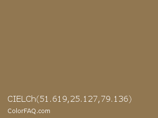 CIELCh 51.619,25.127,79.136 Color is a normal orange color and the nearest color is Pale Brown #987654. Hex code #917751 and RGB value is rgb(145,119,81). In RGB color space, this color is composed of 57% red, 47% green, 32% blue, In CMYK color space, this color is composed of 0% cyan, 18% magenta, 44% yellow , 43% black , In HSL color space, this color has a hue angle of 36° , 28% saturation and 44% lightness.