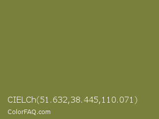 CIELCh 51.632,38.445,110.071 Color is a normal yellow color and the nearest color is Old Moss Green #867e36. Hex code #79803b and RGB value is rgb(121,128,59). In RGB color space, this color is composed of 47% red, 50% green, 23% blue, In CMYK color space, this color is composed of 5% cyan, 0% magenta, 54% yellow , 50% black , In HSL color space, this color has a hue angle of 66° , 37% saturation and 37% lightness.