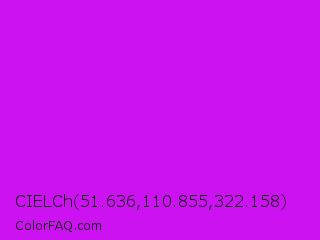 CIELCh 51.636,110.855,322.158 Color is a normal purple color and the nearest color is Vivid Orchid #cc00ff. Hex code #cd12f2 and RGB value is rgb(205,18,242). In RGB color space, this color is composed of 80% red, 7% green, 95% blue, In CMYK color space, this color is composed of 15% cyan, 93% magenta, 0% yellow , 5% black , In HSL color space, this color has a hue angle of 290° , 90% saturation and 51% lightness.
