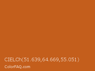 CIELCh 51.639,64.669,55.051 Color is a normal orange color and the nearest color is Orange Roughy #c45719. Hex code #c45e1c and RGB value is rgb(196,94,28). In RGB color space, this color is composed of 77% red, 37% green, 11% blue, In CMYK color space, this color is composed of 0% cyan, 52% magenta, 86% yellow , 23% black , In HSL color space, this color has a hue angle of 24° , 75% saturation and 44% lightness.