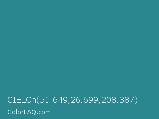 CIELCh 51.649,26.699,208.387 Color is a normal cyan color and the nearest color is Lochinvar #2c8c84. Hex code #2a8790 and RGB value is rgb(42,135,144). In RGB color space, this color is composed of 16% red, 53% green, 56% blue, In CMYK color space, this color is composed of 71% cyan, 6% magenta, 0% yellow , 44% black , In HSL color space, this color has a hue angle of 185° , 55% saturation and 36% lightness.