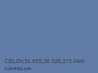 CIELCh 51.655,26.526,275.044 Color is a normal blue color and the nearest color is Hoki #65869f. Hex code #627ca8 and RGB value is rgb(98,124,168). In RGB color space, this color is composed of 38% red, 49% green, 66% blue, In CMYK color space, this color is composed of 42% cyan, 26% magenta, 0% yellow , 34% black , In HSL color space, this color has a hue angle of 218° , 29% saturation and 52% lightness.