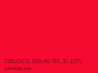 CIELCh 51.659,90.761,31.157 Color is a normal red color and the nearest color is Torch Red #fd0e35. Hex code #f50a30 and RGB value is rgb(245,10,48). In RGB color space, this color is composed of 96% red, 4% green, 19% blue, In CMYK color space, this color is composed of 0% cyan, 96% magenta, 80% yellow , 4% black , In HSL color space, this color has a hue angle of 350° , 92% saturation and 50% lightness.