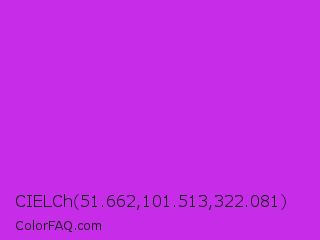 CIELCh 51.662,101.513,322.081 Color is a normal purple color and the nearest color is Steel Pink #cc33cc. Hex code #c72de8 and RGB value is rgb(199,45,232). In RGB color space, this color is composed of 78% red, 18% green, 91% blue, In CMYK color space, this color is composed of 14% cyan, 81% magenta, 0% yellow , 9% black , In HSL color space, this color has a hue angle of 289° , 80% saturation and 54% lightness.