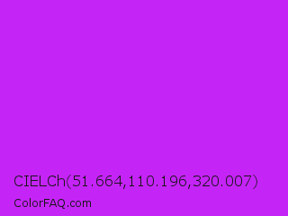 CIELCh 51.664,110.196,320.007 Color is a normal purple color and the nearest color is Vivid Mulberry #b80ce3. Hex code #c524f7 and RGB value is rgb(197,36,247). In RGB color space, this color is composed of 77% red, 14% green, 97% blue, In CMYK color space, this color is composed of 20% cyan, 85% magenta, 0% yellow , 3% black , In HSL color space, this color has a hue angle of 286° , 93% saturation and 55% lightness.