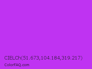 CIELCh 51.673,104.184,319.217 Color is a normal purple color and the nearest color is Veronica #a020f0. Hex code #bf33f2 and RGB value is rgb(191,51,242). In RGB color space, this color is composed of 75% red, 20% green, 95% blue, In CMYK color space, this color is composed of 21% cyan, 79% magenta, 0% yellow , 5% black , In HSL color space, this color has a hue angle of 284° , 88% saturation and 57% lightness.