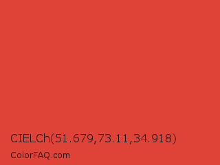 CIELCh 51.679,73.11,34.918 Color is a normal red color and the nearest color is Cinnabar #e34234. Hex code #df4237 and RGB value is rgb(223,66,55). In RGB color space, this color is composed of 87% red, 26% green, 22% blue, In CMYK color space, this color is composed of 0% cyan, 70% magenta, 75% yellow , 13% black , In HSL color space, this color has a hue angle of 4° , 72% saturation and 55% lightness.