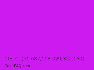 CIELCh 51.687,108.929,322.169 Color is a normal purple color and the nearest color is Vivid Mulberry #b80ce3. Hex code #cc1af0 and RGB value is rgb(204,26,240). In RGB color space, this color is composed of 80% red, 10% green, 94% blue, In CMYK color space, this color is composed of 15% cyan, 89% magenta, 0% yellow , 6% black , In HSL color space, this color has a hue angle of 290° , 88% saturation and 52% lightness.