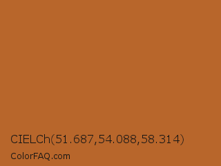 CIELCh 51.687,54.088,58.314 Color is a normal orange color and the nearest color is Ruddy Brown #bb6528. Hex code #b8662b and RGB value is rgb(184,102,43). In RGB color space, this color is composed of 72% red, 40% green, 17% blue, In CMYK color space, this color is composed of 0% cyan, 45% magenta, 77% yellow , 28% black , In HSL color space, this color has a hue angle of 25° , 62% saturation and 45% lightness.