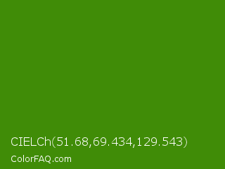 CIELCh 51.68,69.434,129.543 Color is a dark green color and the nearest color is La Palma #368716. Hex code #408c07 and RGB value is rgb(64,140,7). In RGB color space, this color is composed of 25% red, 55% green, 3% blue, In CMYK color space, this color is composed of 54% cyan, 0% magenta, 95% yellow , 45% black , In HSL color space, this color has a hue angle of 94° , 90% saturation and 29% lightness.