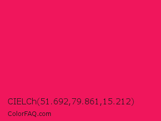 CIELCh 51.692,79.861,15.212 Color is a normal rose color and the nearest color is Razzmatazz Crayola #e30b5c. Hex code #f0165c and RGB value is rgb(240,22,92). In RGB color space, this color is composed of 94% red, 9% green, 36% blue, In CMYK color space, this color is composed of 0% cyan, 91% magenta, 62% yellow , 6% black , In HSL color space, this color has a hue angle of 341° , 88% saturation and 51% lightness.