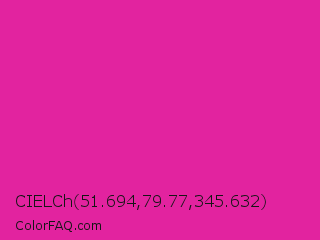 CIELCh 51.694,79.77,345.632 Color is a normal magenta color and the nearest color is Barbie Pink #e0218a. Hex code #e2239f and RGB value is rgb(226,35,159). In RGB color space, this color is composed of 89% red, 14% green, 62% blue, In CMYK color space, this color is composed of 0% cyan, 85% magenta, 30% yellow , 11% black , In HSL color space, this color has a hue angle of 321° , 77% saturation and 51% lightness.