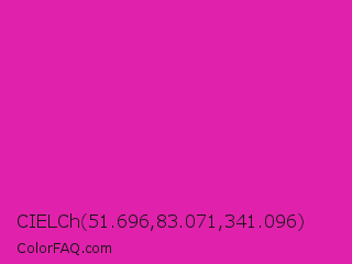 CIELCh 51.696,83.071,341.096 Color is a normal magenta color and the nearest color is Frostbite #e936a7. Hex code #e021ab and RGB value is rgb(224,33,171). In RGB color space, this color is composed of 88% red, 13% green, 67% blue, In CMYK color space, this color is composed of 0% cyan, 85% magenta, 24% yellow , 12% black , In HSL color space, this color has a hue angle of 317° , 75% saturation and 50% lightness.