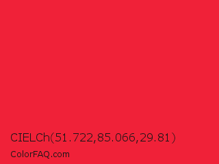 CIELCh 51.722,85.066,29.81 Color is a normal red color and the nearest color is Imperial Red #ed2939. Hex code #f02138 and RGB value is rgb(240,33,56). In RGB color space, this color is composed of 94% red, 13% green, 22% blue, In CMYK color space, this color is composed of 0% cyan, 86% magenta, 77% yellow , 6% black , In HSL color space, this color has a hue angle of 353° , 87% saturation and 54% lightness.