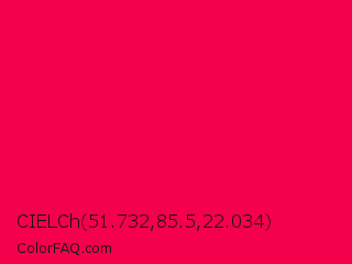 CIELCh 51.732,85.5,22.034 Color is a normal rose color and the nearest color is Folly #ff004f. Hex code #f5004a and RGB value is rgb(245,0,74). In RGB color space, this color is composed of 96% red, 0% green, 29% blue, In CMYK color space, this color is composed of 0% cyan, 100% magenta, 70% yellow , 4% black , In HSL color space, this color has a hue angle of 342° , 100% saturation and 48% lightness.